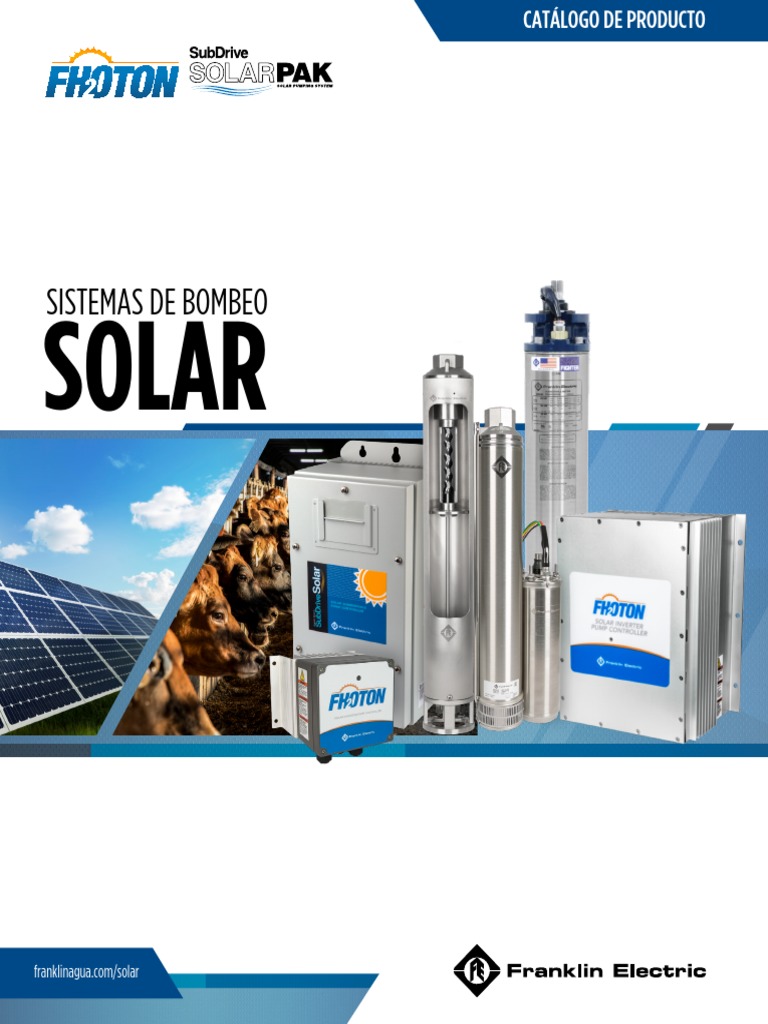 Es un sistema de bombeo solar que permite operar desde 2 paneles solares de 270w en modelos de 0 5hp. Franklin electric is committed to developing new systems for renewable energy relying on our proven system technologies. In many remote locations around the world traditional power is unavailable or unreliable to power a submersible pump and motor. Nuestro sistema cubre rangos de operación de 0 5 a 1 5 hp y 5 a 90 gpm con una carga máxima de 240 metros 787 pies.